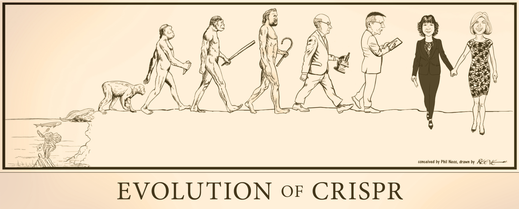 The Evolution of CRISPR illustrates its climb out of the primordial oceananic soup on the backs of eukaryotic cells and their friends to its discovery, characterization and patenting by scientists like Francisco Mojica, Virginijus Šikšnys, and Emmanuelle Charpentier and Jennifer Doudna.