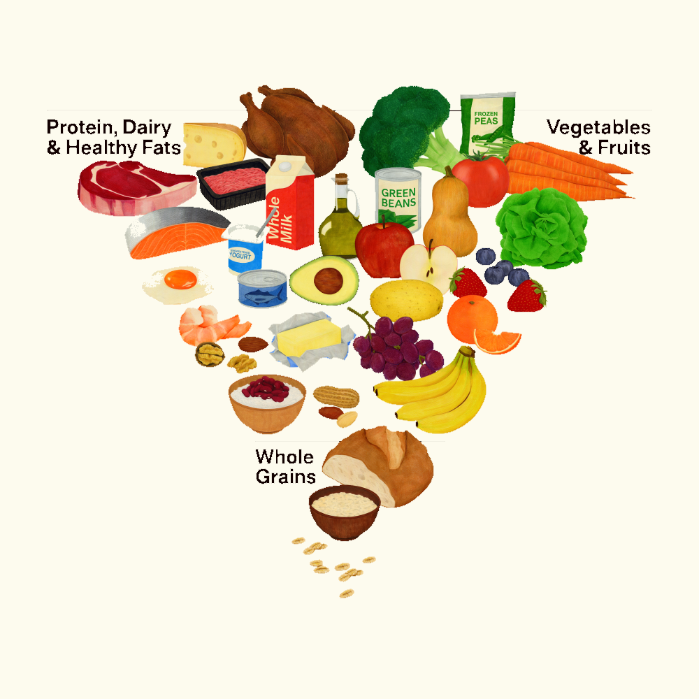 The guidelines emphasize consumption of fresh vegetables, whole grains and dairy products, long advised as part of a healthy eating plan. Officials released a new graphic depicting an inverted version of the long-abandoned food pyramid, with protein, dairy, healthy fats and fruits and vegetables at the top and whole grains at the bottom.